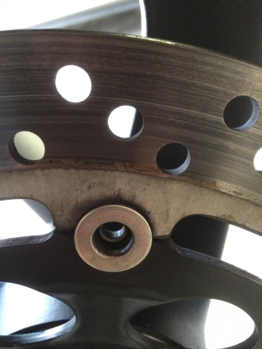 danke für Deine Antwort! Also ehrlich gesagt, kamen mir zwischenzeitlich auch ein paar Zweifel auf, die sich aber aufgrund des sehr guten Allgemeinzustandes der Maschine nicht erhärtet haben. Das Radlager scheint ja ohnehin in Ordnung zu sein. Das war ja offensichtlich eine Fehleinschätzung von mir bezüglich des Spiels im Bereich der Achse (es handelt sich ja eher um die Drehbewegung, die ich bei der "Tast-Methode" verspürt hatte - sieht oben). Die Scheibe habe ich mir eben noch einmal genauer angesehen. Mit dem Messschieber habe ich ca. 4,7 mm Scheibendicke ermittelt - wobei die Dicke nach Außen hin "etwas" abnimmt (die Schieblehre kippelt ein wenig). Riefen oder Grat sind nicht verspürbar. Anbei noch ein paar Fotos der Scheibe vorn. Danke und Gruß, Klaus.