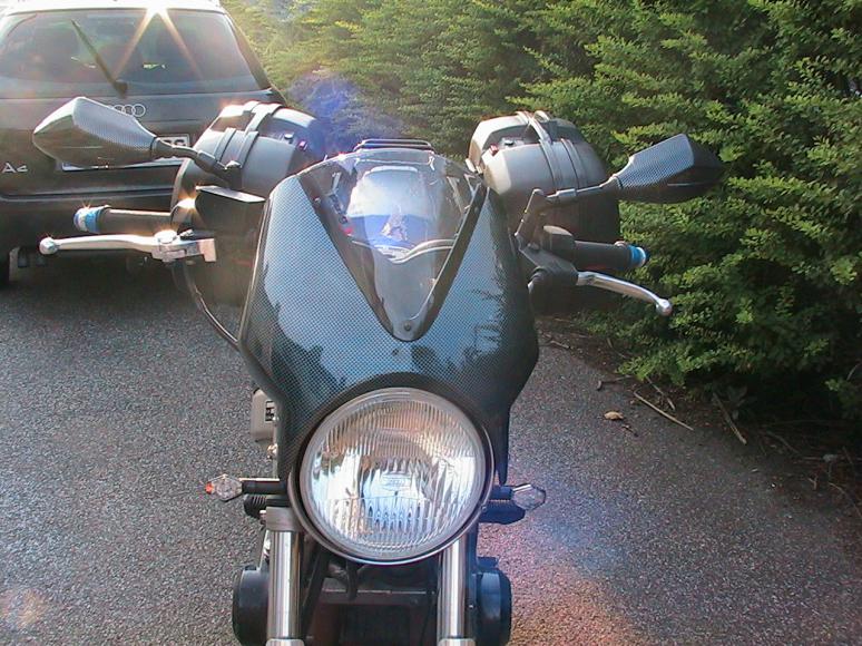 Die Idee mit der Eigenbau-Lampenmaske finde ich nicht schlecht. Ich würde sie auf höhe der Tachobecher abschliessen lassen.