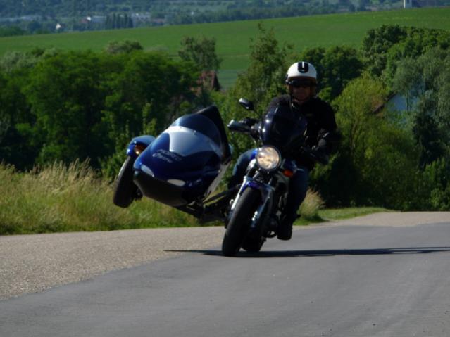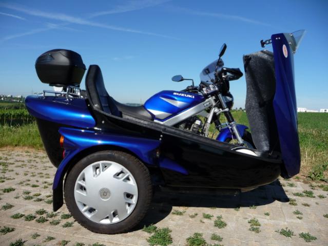 wie auf Facebook bereits versprochen, nachfolgend die Umbaustory meiner GS zum Gespann, welche vor ca. 2 Wochen im Sidecar-Traveller (http://www.sidecar-traveller.com/) veröffentlicht wurde. Viel Spaß beim Lesen. SUZUKI GS 500 Low-Cost Gespann Vor ein paar Jahren haben wir uns unser Wunsch-Gespann bauen lassen, eine BMW R1200R mit EML GT 2001 Seitenwagen. Für die Fahrt zu zweit, mit Hund und Gepäck, in unseren Augen ein Traum. Für den Alltag war uns das Gespann jedoch zu schade, zu sperrig, zu schwer zu rangieren. Als ich dann vor zwei Jahren von einem Arbeitskollegen die von seiner Frau gefahrene SUZUKI GS 500 für kleines Geld angeboten bekam, habe ich deshalb prompt zugegriffen. Zwar bereits 12 Jahre alt, aber in Summe nur 2.500 Kilometer gefahren und in annähernd neuwertigem Zustand. Als Zweit-Moped, für den Weg zur Arbeit und für zwischendurch, genau das Richtige. Die GS wurde im Laufe der Zeit etwas verändert. Die Gabel bekam WILBERS Federn spendiert um ihr die Teigigkeit zu nehmen, das Federbein wurde durch ein EcoLine desselben Herstellers ersetz um dem Heck das Pumpen abzugewöhnen. Der im Original rostanfällige und durch einen Umfaller der Vorbesitzerin unschön gewordene Schalldämpfer wurde durch ein Pendant aus Edelstahl von BSM ersetzt. Dem Fahrtwind wurde durch eine MRA Touren Scheibe Einhalt geboten. Alles auf verschiedenen Internet Plattformen für weinige Euro ergattert. Bald schon beschlich mich jedoch das Gefühl, dass da dennoch etwas fehlt, irgendwie unvollständig erschien mir meine Suzi. Erschwerend hinzu kamen die traurigen Augen meiner Australien Shepherd Hündin Peanut, wenn ich die GS statt des Gespanns genommen habe und sie zu Hause bleiben musste. Bei verschiedenen Gespann Herstellern im süddeutschen Raum wurde ich vorstellig um ein Angebot für einen preiswerten Umbau auf GS Basis zu erhalten. Ausnahmslos wurde ich darauf hingewiesen, dass mit den originalen Gussrädern ein Gespann Umbau nicht zulassungsfähig wäre. Nach etwas über einem Jahr kam ich beim Europäischen Gespann Treffen EGT mit Karl Schmied einem Gespannbauer aus Oberschwaben ins Gespräch. Er erklärte sich trotz aller Bedenken bereit, mein Vorhaben mit seinem Sachverständigen durchzusprechen. Nach einer Woche erhielt ich positiven Bescheid, mit der Prämisse, die Zuladung auf zwei normal gewachsene Personen plus etwas Gepäck begrenzen zu müssen. Für die von mir vorgesehene Anwendung kein Problem. Annähernd zeitgleich, welch Fügung des Schicksals, tauchte auf der Homepage eines anderen Gespannherstellers ein gebrauchter MOBEC Gipsy Beiwagen auf, der mir, als Einsitzer, nicht nur von den Proportionen passend erschien, sondern, da vormals an einem SUZKI Roller montiert, auch noch dieselbe Farbe wie die GS 500 hatte. Der Boot inklusive Fahrgestell und Anbauteilen, knapp 10 Jahre alt, in gut erhaltenem Zustand und mit neuem Reifen, konnte ich zu weniger als einem Drittel des Neupreises erstehen. Lediglich eine gründliche Reinigung von Boot und Fahrgestell sowie ein Wechsel der Bremsbeläge waren erforderlich. An der Suzuki mussten nur geringfügige Modifikationen vorgenommen werden, um für den Gespann Betrieb fit zu sein. Mit dem Fahrwerk update war das Krad bereits gut gerüstet für die zusätzliche Belastung. In Eigenregie wurde die Vorderradgabel zusätzlich mit einem KERN Stabilisator verstärk, die Bremsleitungen durch Stahlflex Exemplare ersetzt und die elektrischen Anschlüsse für den Seitenwagen entsprechend der Erfordernissen vorbereitet und mit SUPERSEAL Steckern ausgerüstet. Aus Sicherheitsaspekten habe ich dann noch gleich einen Warnblinkanlage nachgerüstet. Anfang April wurde dann die SUZUKI sowie das Boot auf einen Anhänger geladen und zu Herrn Schmied gebracht. Bereits nach drei Wochen erhielt ich einen Anruf, dass das Gespann dem Sachverständigen vorgestellt worden sei, dieser die Radlast am Hinterrad für die originale Gussfelge jedoch als zu hoch befunden hätte und eine Umrüstung des Hinterrades auf eine PKW-Felge oder auf ein Drahtspeichenrad erforderlich wäre. Da eine Anpassung der Übersetzung ohnehin erforderlich gewesen wäre, fiel die Entscheidung zu Gunsten der PKW Felge, der Umbau verteuerte sich hierdurch leider um ein Drittel. Weitere zwei Wochen später war das Gespann dann fertig gestellt und vom Prüfer abgenommen. Eine kurze Probefahrt vor Ort bestätigte die Richtigkeit der Entscheidung sowie die Qualität des Umbaus. Karl Schmied hat einen Hilfsrahmen parallel zum geschraubten rechten Rahmenunterzug angefertigt um eine Vier-Punkt Aufnahme zu realisieren. Zusätzlich wurde der Hilfsrahmen aus Vierkantrohr noch mit der rechten Fußrasten Aufnahme verschraubt. Das Rahmenheck wurde zusätzlich mittels Querstrebe versteift, eine Hilfsrahmen Aufnahme wurde unterhalb der Sitzbank angeschweißt. Das Hinterrad wird nun von einer 15 Zoll SMART Stahlfelge geführt und ist mit einem MAXXIS Reifen in 135 mm Breite ausgestattet. Das Ventil des Rades musste von der Felgenaußen- auf die Innenseite versetzt werden um Platz für die Bremsscheibe und den -sattel zu schaffen. Der Beiwagen wird zusammen mit der Vorderradbremse verzögert, das Gespann bleibt so auch bei einer Vollbremsung sauber in der Spur. Etwaige Pendelneigung der Gables wird mittels am Bremssattel befestigten Lenkungsdämpfers bereits im Keim erstickt. Auf mittlerweile 2.000 gefahrenen Kilometern überzeugte das Gespan mit neutralem, ausgewogenem Fahrverhalten, moderaten Lenkkräften und ausreichend Leistung für den Alltagsbetrieb. Der Beiwagen beweist mit geräumigem Kofferraum sowie klappbarem Fronteinstieg seine Alltagstauglichkeit und wurde von Peanut für Hundetauglich befunden. Um dem gesteigerten Gewicht Rechnung zu tragen ist die Feder des Federbeins etwa zur Hälfte vorgespannt, die Gabelfedern werden wohl noch 8 – 10 mm hohe Distanzbuchsen zur Vorspannung erhalten, dann ist aber auch gut. Natürlich hätte ich für die inklusive Beschaffungskosten für das Krad investie