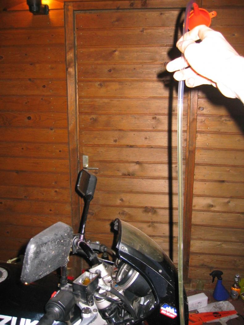 Den Schlauch lang genug lassen (muss bis weit über den Behälter am Lenker hochreichen) und auf die Ablassschraube stecken – auf die andere Seite den Trichter) – man sieht auch wunderbar das Chaos von den ganzen Bastelarbeiten *g*: