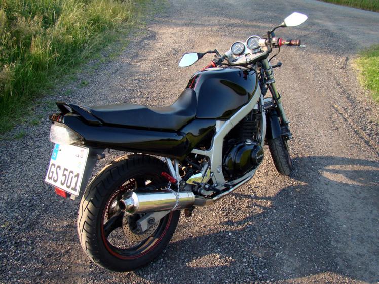 Suzuki GS 500 E GM51B Bj. 1990 – 22.000 km Umbauten / Änderungen: - Höherlegung - Progressive Gabelfedern + 15er Öl - Stahlflex komplett - Rahmen schwarz - Signalroter Lack - Gabel golden lackiert - Rücklichtumbau (noch nicht ganz fertig) - Miniblinker - neue Griffe - Lenkerendenspiegel - Gabelbrücke poliert - Tankdeckel poliert - Felgenbetten poliert - Sitz neu gepolstert und bezogen - neuer Schalldämpfer - Unterbodenverkleidung abgesägt |