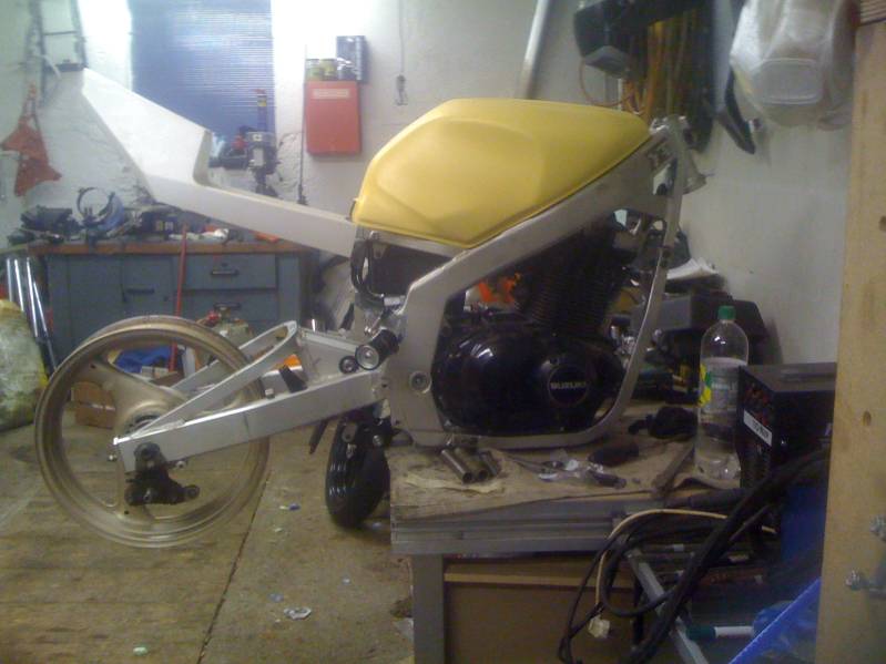 * GSX 400 RR mit Überzug von 1989, mit 4,5 x 17er Felge mit nem 160er inkl. Wilbers 631 mit externem Behälter