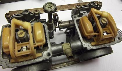 Du schraubst bitte noch die Hauptdüsen raus, das sind die Großen in der Mitte. Das goldfarbene Teil, in dem das Schwimmernadelventil steckt, kannst Du auch einfach rauszeihen, ist nur gesteckt. Die Leerlaufdüsen sind in dem Stutzen gleich neben den Hauptdüsen, die kannst Du mit einem 4mm Schlitzschraubendreher rausschrauben. Dann noch die Leerlauf-Luftschrauben raus (auf dem Foto zwischen den Kreuzschlitzschrauben der Vergaserbefestigung), und danach mal die Gaser umdrehen und vorsichtig auf die Unterlage klopfen, dann sollte da je noch eine kleine Feder und eine kleine Scheibe rausfallen.
