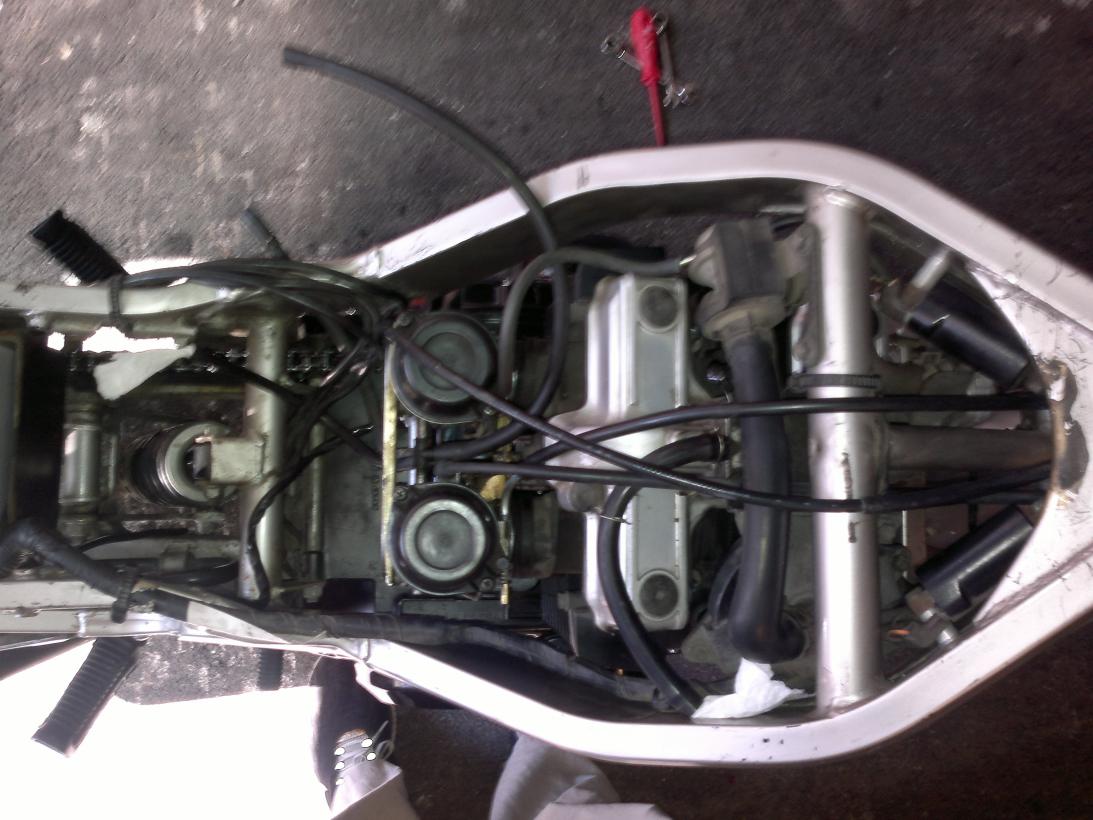 Hier noch ein Bild auf dem man sehen kann wo der Schlauch vom linken Vergaserdeckel hinführt.