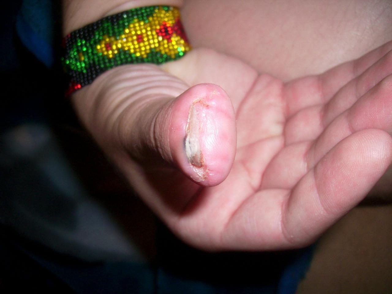 aber der daumen sieht auch darum noch so "normal" aus, mit nagel und so, weil die haut über den eingekürzten knochen gezogen und zusammengenäht wurde. darum spannt es auch leicht wenn ich den stummel abknicke und es knackt andauernd ziemlich laut^^ ich denke ich hatte glück mir nicht noch n paar mm mehr weggesäbelt zu haben, da mir so der nagel geblieben ist...war nur n winziger fetzen, der aber super nachgewachsen ist |