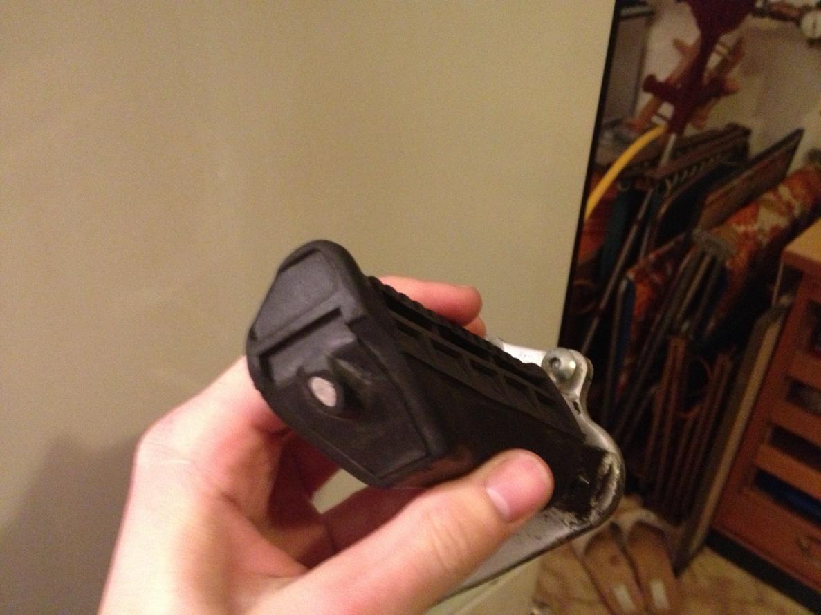 Die sind nicht verschraubt, das Gummi ist auf den Grundkörper aufgeschoben. Die Raste ist am Rastenträger mit nem Bolzen gesichert. Und die Raste ist auch beweglich gelagert, sodass es beim Aufsetzen nicht zum Aushebeln kommt.
