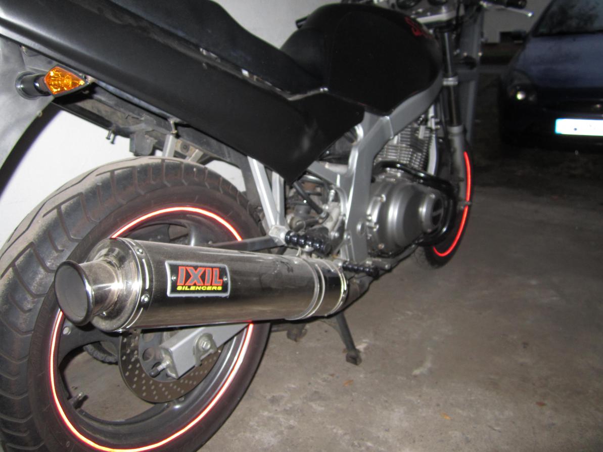 Tank/ Verkleidungsteile matt schwarz, Rahmen glänzend schwarz, LED RL schwarz, Halogen Blinker, HI-Q Top Grip Alu Fußrasten schwarz, Polisport Halo LED Maske, IXIL Competition Range ESD, weisse Felgenrandaufkleber, Balu Racing Bugspoiler, Progressive Gabelfedern, Koso db01r, Lenkerenden schwarz, Edelstahl Kettenschutz schwarz, schwarze Brems-/ Kupplungshebel, Stahlflex Lucas vorn, YSS Federbein, Sturzpads GSG, Universal Kennzeichenhalter Geändert von Teufelchen88 (06.12.2012 um 13:13:29 Uhr) |