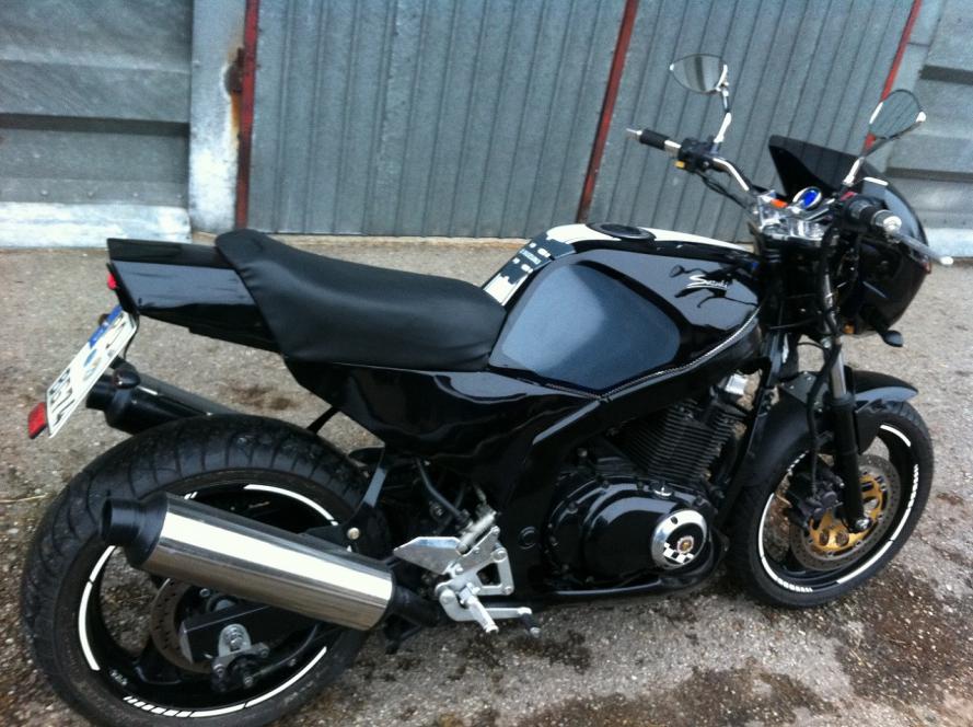 Möglicherweise kann man von einer GSX 600 die beiden Endtöpfe an abgeänderte Krümmer anbauen, oder man nimmt den Serientopf der GS und ändert den ab.