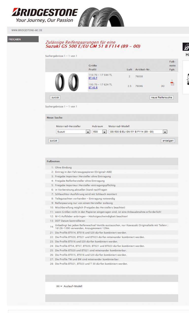 Hab heut mal gegoogelt nach der Reifenfreigabe für den BT45... Bin dann auf die tolle Seite von Bridgestone gestoßen, wo man nach Motorrad Modell suchen kann...