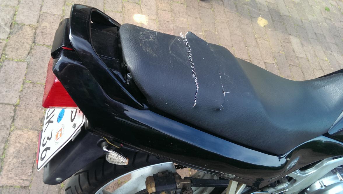 Die GS hat mehrere tiefe Kratzer im Tank, die Sitzbank wurde aufgeschlitzt, diverse Schäden vom Hinlegen sowie am Motordeckel.