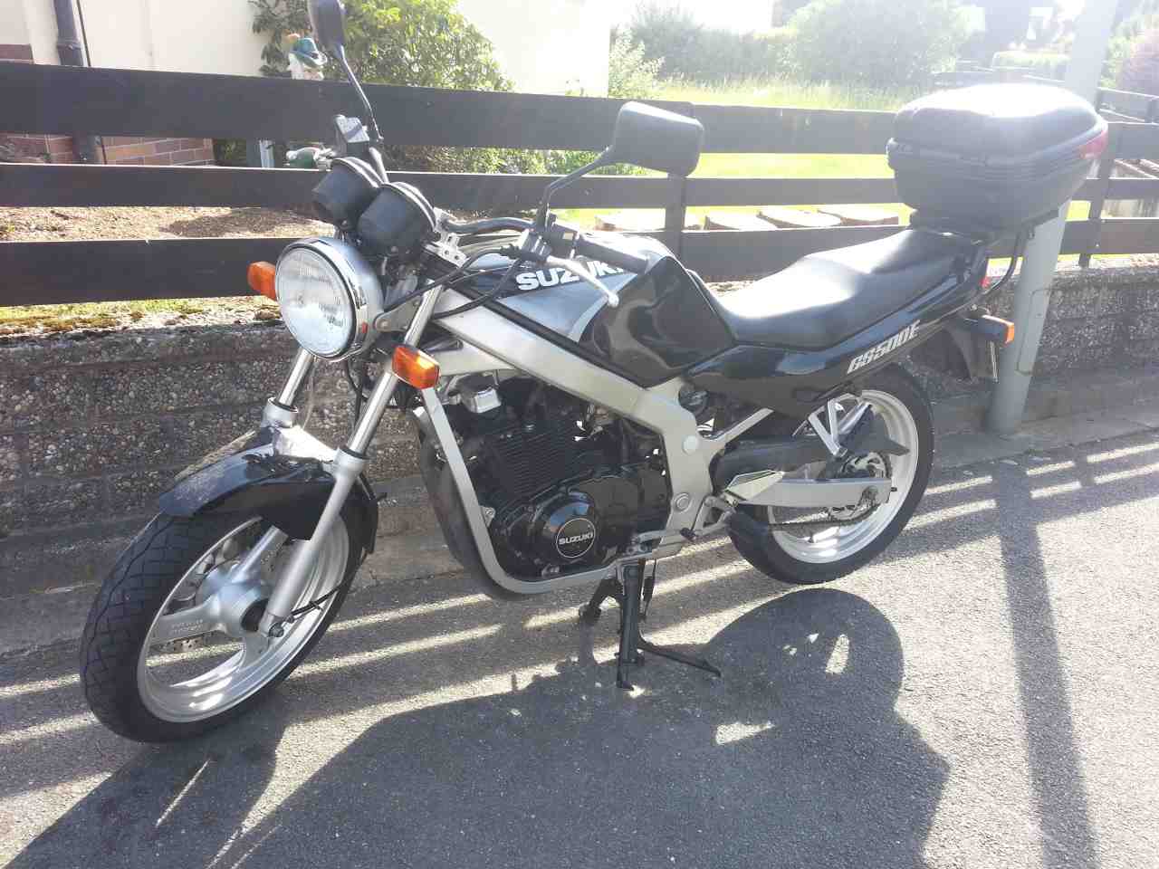 Sie hat Ihre Gebrauchsspuren, aber das darf sie auch haben nach 21 Jahren. Hier und da ein Kratzer, aber nicht von einem Sturz. War das Bike der Ehefrau und nach der Geburt des Kindes fuhr sie nicht mehr. So stand sie Jahre lang. Sie ist tiefer gelegt, aber gut ich bin auch nicht der größte mit meinen 168cm, ich finde die Höhe ok. TÜV, Bremsbeläge vorne und hinten und der komplette Kettensatz sind neu. Öl und Bremsflüssigkeit sind ca. 1000 km alt. Sie hat einen Superbikelenker, den Koffer mit Gepäckbrücke und Stahlflexleitungen. Dazu bekommen habe ich noch einmal Bremsbeläge für hinten, hat sie aus versehen 2x bestellt, ein kleineres Ritzel für vorne und Original Knochen (Tieferlegung) und wie nennt man das Teil hinten das man abschraubt um den Gepäckbrücke zu montieren? Teile sind eingetragen und ABEs sind auch dabei. Das Lenkkopflager fühlte sich gut an. Rost fand ich nur ganz leicht am Lampengehäuse, an der Kante zum Chromring. Beide Simmerringe vorne an der Gabel machen einen guten Eindruck, auch keine Kratzer an der Gabel. Motorrad war nicht gereinigt, so war ich mir sicher das der Motor auch nirgends Ölverlust hat. Das Motoröl roch normal und war noch hell und klar und auch die Bremsflüssigkeit. Die Probefahrt verlief ohne Mängel, Motor war kalt und sprang auch ohne Choke sofort an, nahm sauber Gas an bei jeder Drehzahl und ich hörte keine ungewöhnliche Geräusche. Die Gänge ließen sich einwandfrei hoch und runter schalten. Die Bremsen verzögern gewaltig. Bei 1000€ schlug ich zu und wir machten einen Kaufvertrag ohne Bemerkungen wie "Gekauft wie gesehen, ohne Garantie, usw."Nö, die ein zigste Zusatzbemerkung war das ich sie nächste Woche ummelde. Die Heimfahrt von Raum Forchheim zu mir nach Hause über die fränkische Schweiz machte dann auch richtig Spaß. Selbst der Sprit langte locker bis nach Bayreuth.