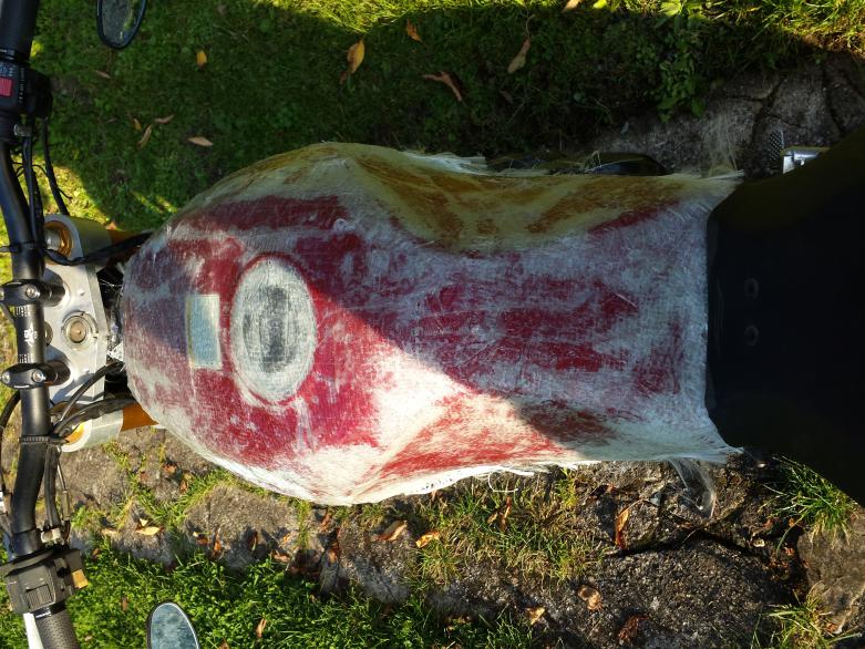Bugverkleidung soweit verbunden und grob angepasst. Auch der Frontfender aus drei Teilen zu einem Stück zusammengefügt - war das ne Sch...Arbeit das Ding zu fixieren um das grade zusammen zu laminieren! ![]() Die Tankhaube hat auch schon mal seine grobe Grundform.