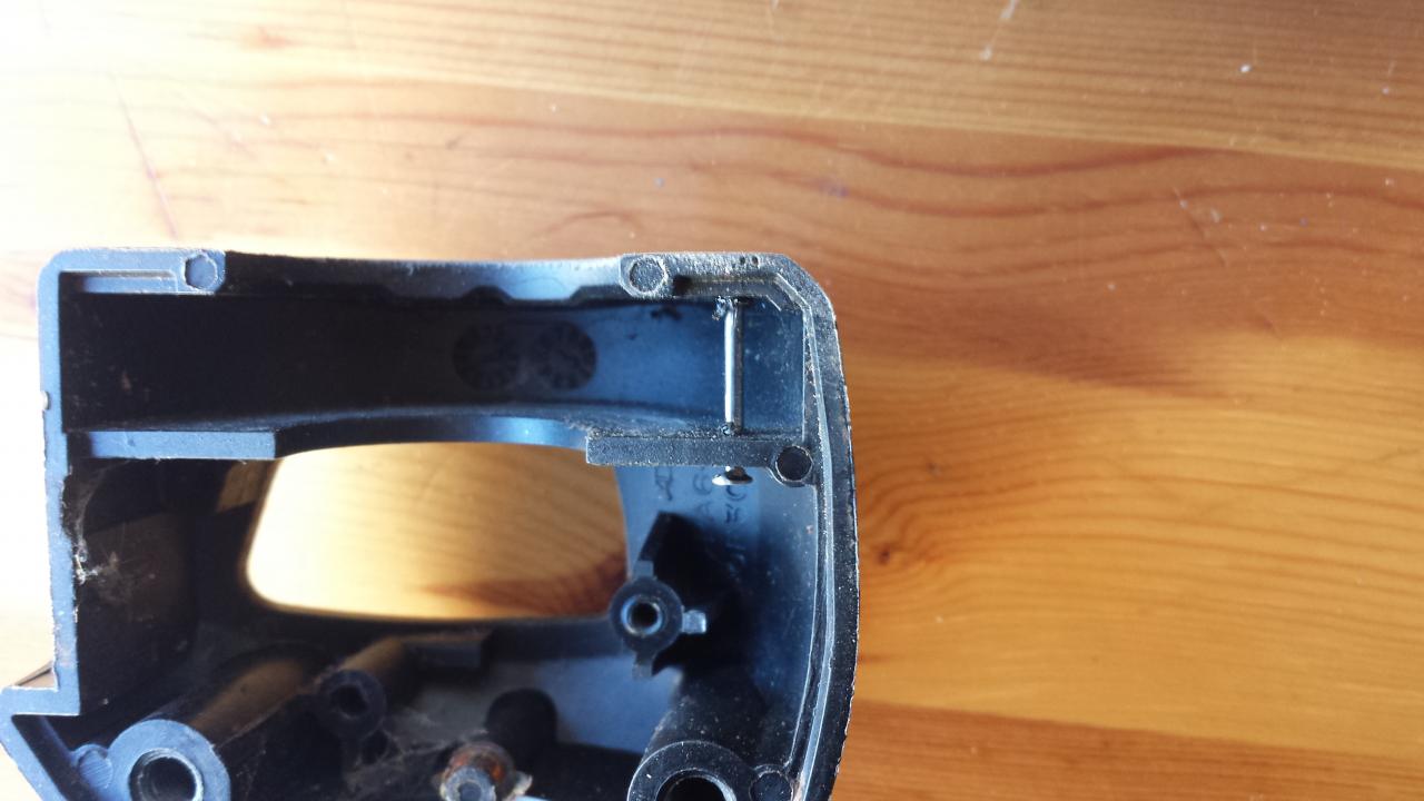 Den Stift hab ich einfach nur rot glühend erhitzt und durchgeschoben, dann wieder rausgezogen, das aufgeschmolzene Plastik weggeschliffen und einen neuen Stift wieder rotglühend erhitzt und dann komplett durchgeschoben und abkühlen lassen (sitzt bombenfest). Den außen überstehenden Teil habe ich dann abgeknipst und nochmal flachgeschliffen.