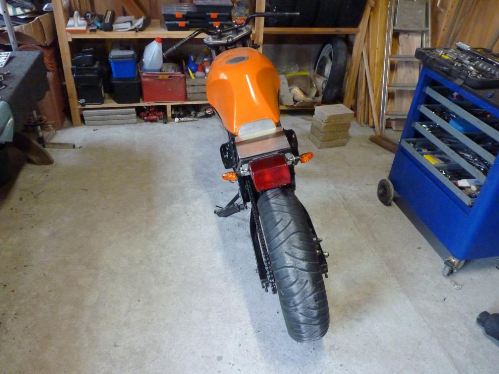 Da ich sowieso alles zerlegt habe, habe ich auch gleich auf eine Sv 650 Felge mit nem 160er Reifen umgebaut mit 3 mm Kettenversatz. Die Ankerstrebe muss ich aber auch noch ändern...hatte bisher aber noch keine Lust