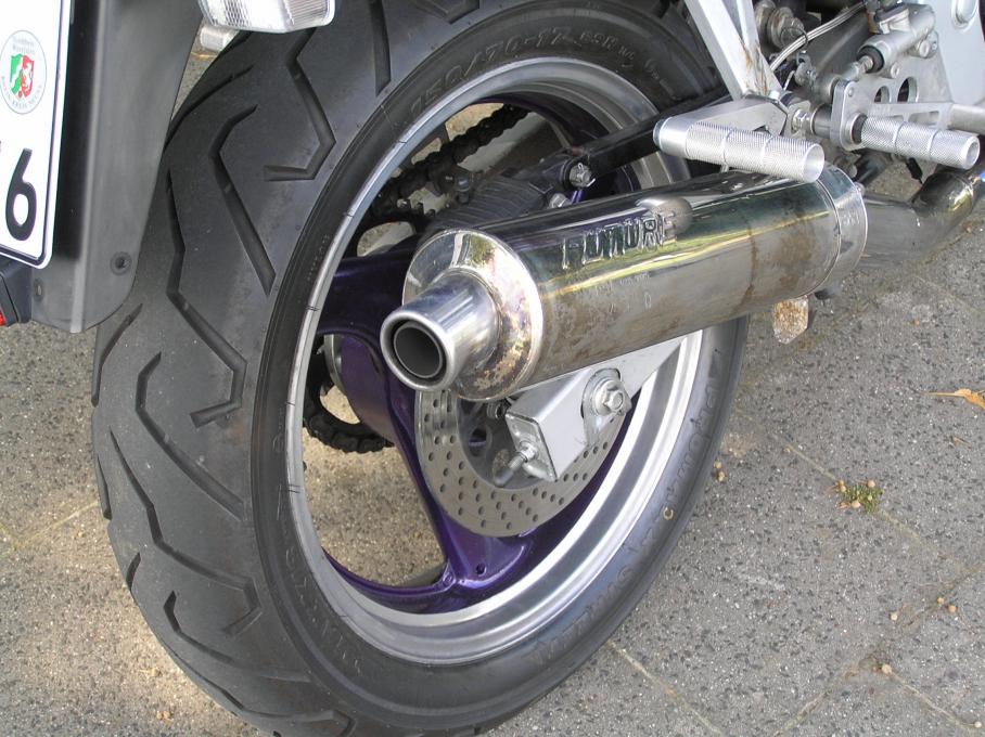 Felge 50€ Strebe 10€ Distanzen 45€ Eintragung 35€. Einen Reifen hätte ich eh kaufen müssen, deshalb lasse ich den in der Rechnung mal raus. Reifendimension ist nun ein 150/60-17 auf eben der 4" Felge der Bandit. |