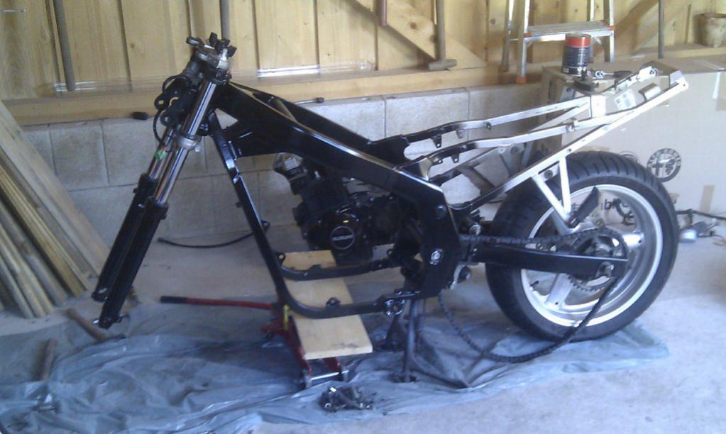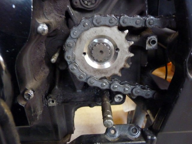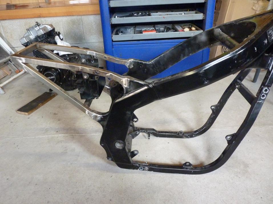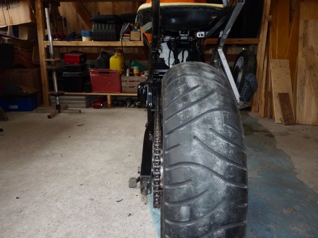Da ich sowieso alles zerlegt habe, habe ich auch gleich auf eine Sv 650 Felge mit nem 160er Reifen umgebaut mit 3 mm Kettenversatz. Die Ankerstrebe muss ich aber auch noch ändern...hatte bisher aber noch keine Lust