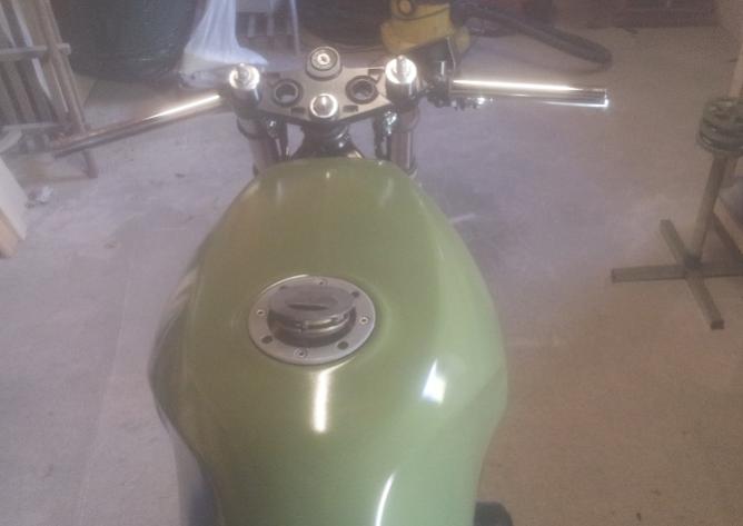 Hier noch ein Bild von den Lenkern. Musste mich auch leider über die ortsansässigen "strahler" und deren unverschämte Preise ärgern und hab mir einfach selbst eine Sandstrahlkabine gebaut und meine Teile und Felgen selber gestrahlt. Sry wegen der Bildqualität, hab auch meine Handykamera mitgestrahlt