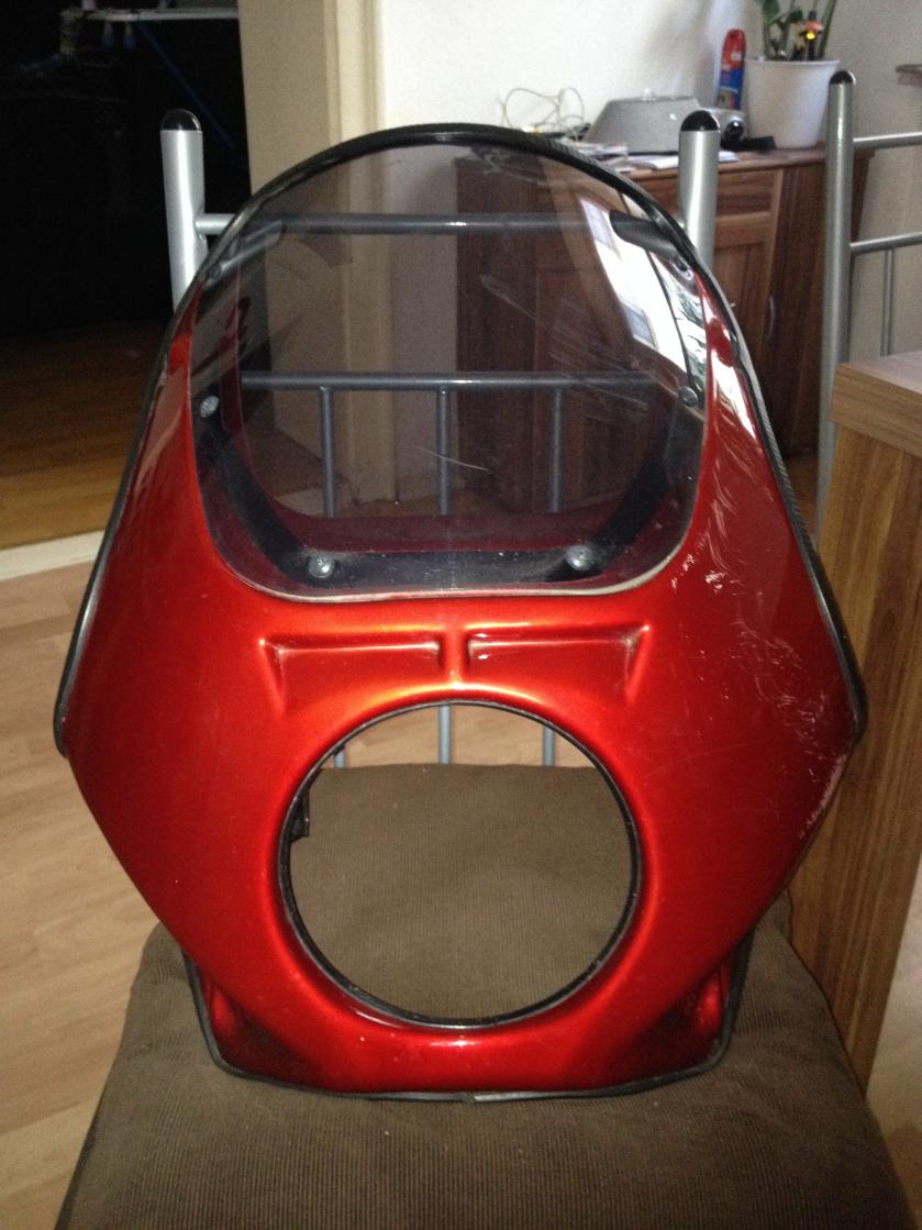 Nachdem ich jetzt schon sehr viel umgebaut habe, möchte ich nun auch das Windschild was ich mittlerweile häßlich finde durch eine Five-Stars Kanzel ersetzen, ich hatte Glück eine solche bei Ebay-Kleinanzeigen günstig zu erwerben, aber leider fehlt die ABE bzw. Materialgutachten dazu.
