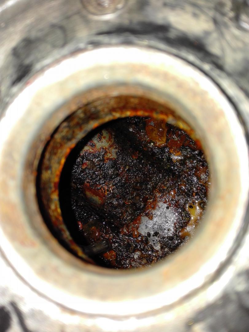 Der schwarze Belag könnte auch Metalloxid (bei einem Stahltank Eisenoxid = Rost) sein. Rost muss nicht immer braun sein.