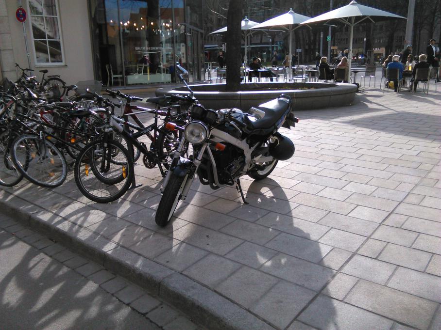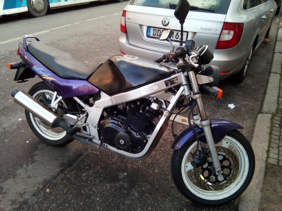 Eine blau-silberblaue GS am Samstag Morgen. Stand neben mir an der Ampel, Zähringer Straße. Auf der linken Tankseite war der Suzuki-Schriftzug in Spiegelschrift angebracht.