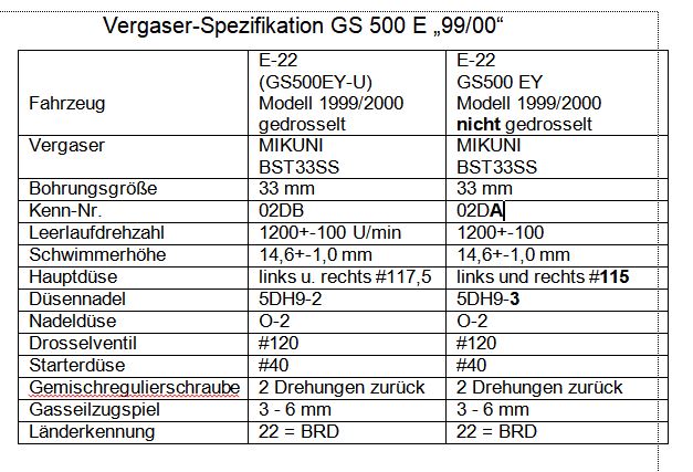 Ich habe Dir mal aus meine Suzukiunterlagen von 2006 eine Gegenüberstellung der Vergasereinstellungen/-bestückungen für das Modell 99/00 angehängt. Vielleicht ist beim Entdrosseln was übersehen worden. Die Größe der Hauptdüse bei der offenen Version #115 (gedrosselt #117,5) ist kein Schreibfehler, das ist so, daß die kleiner ist.