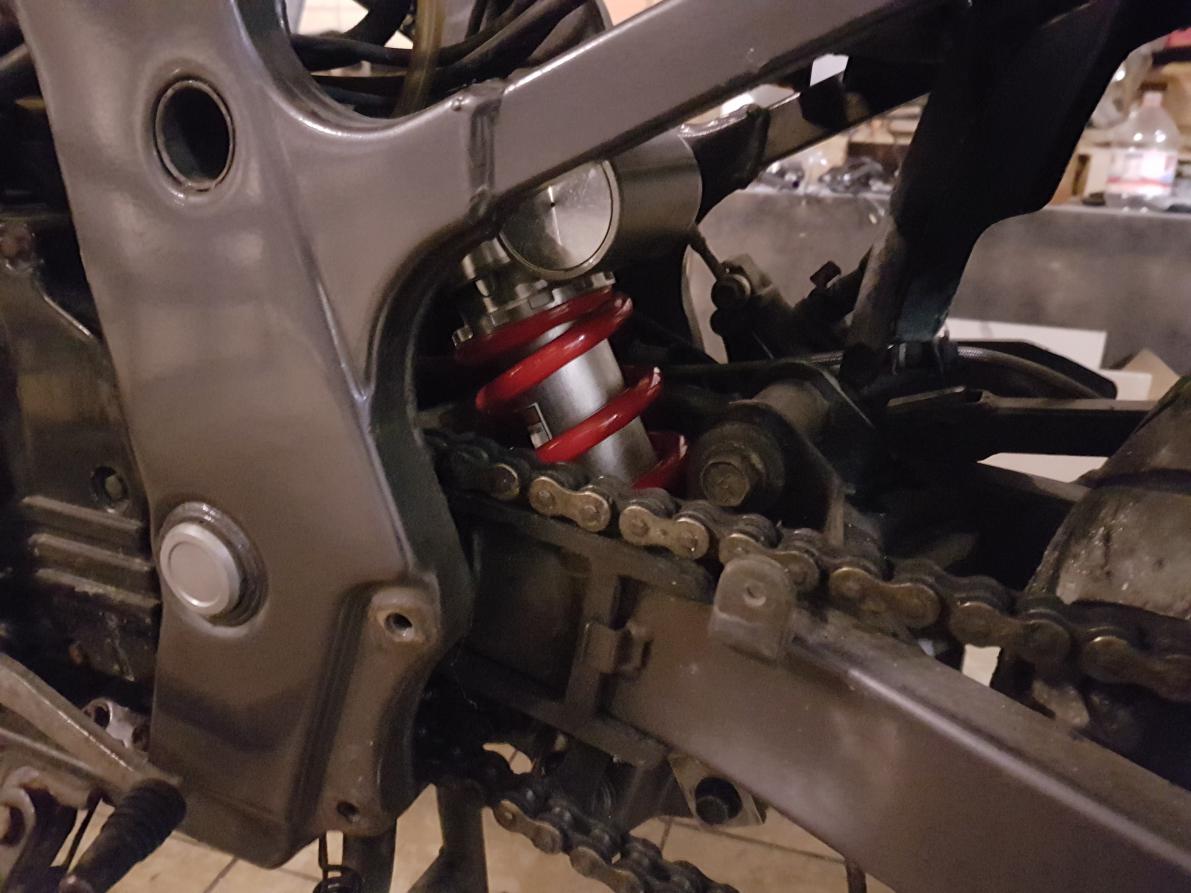 Nach langer Recherche im Forum wurde ich auf das R6 Federbein aufmerksam. Voller Tatendrang ersteigerte ich mir dieses Federbein fast neu für sehr kleines Geld bei eBay. Ein Kollege aus der Meisterschule konnte mir die für den Umbau nötigen Buchsen drehen. Ich hatte Glück! Das Federbein hat noch 1mm Luft zur Schwinge mit dem originalen Umlenkhebel. Aus meiner Sicht reicht dass, denn der Platz wird ja nicht weniger. Im Zweifelsfall rüste ich eben noch den Umlenkhebel der Bandit nach. Apropos Umlenkhebel, die Lager wurden bei der Gelegenheit vom alten Fett befreut und durch neues ersetzt.