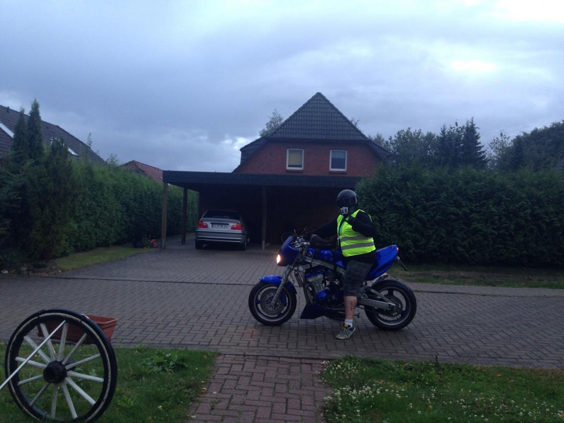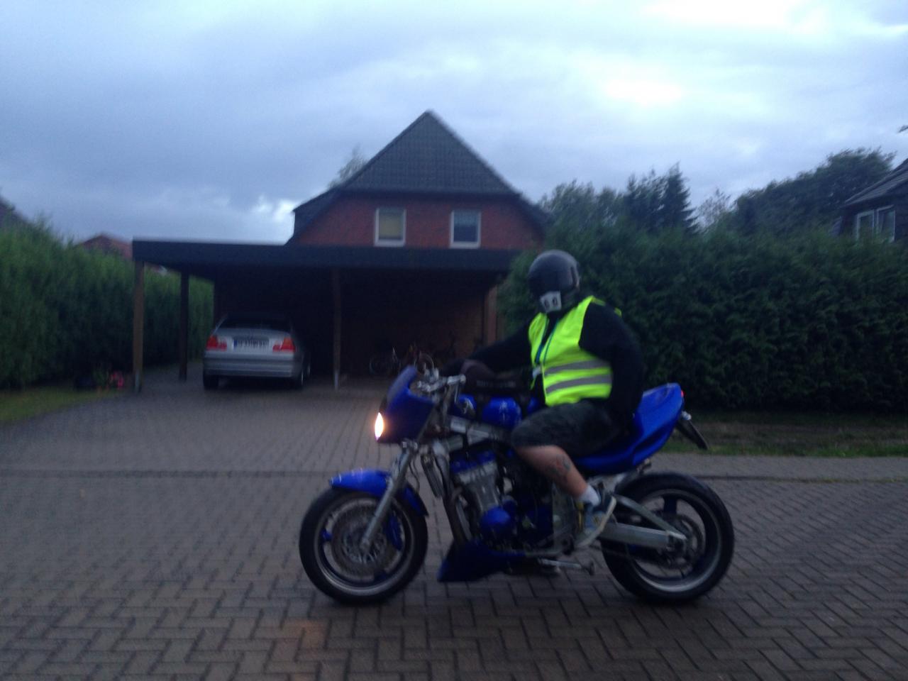 Ich würde gerne einen Streetfighter-Fahrer mit einer gelben Warnweste auf seinem blauen Bike sitzen sehen.