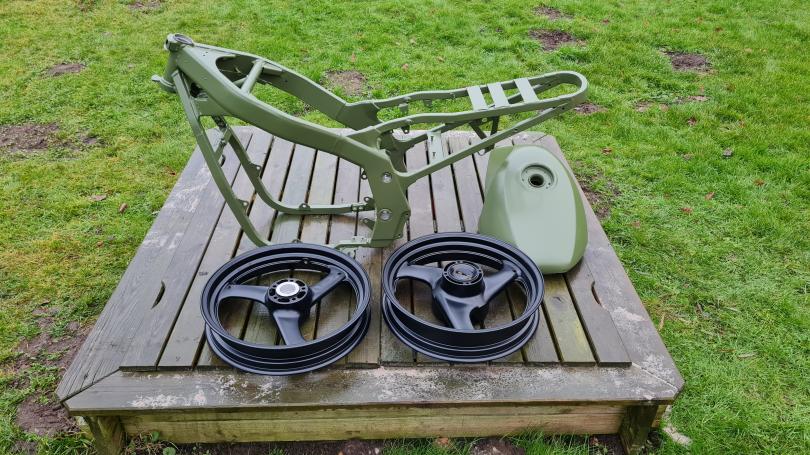 Der gesamte Rahmen und alle Anbauteile werden noch gestrahlt und in anderen Farben pulverbeschichtet. Die Bilder zeigen den Zustand bei Kauf und den aktuellen Stand. |