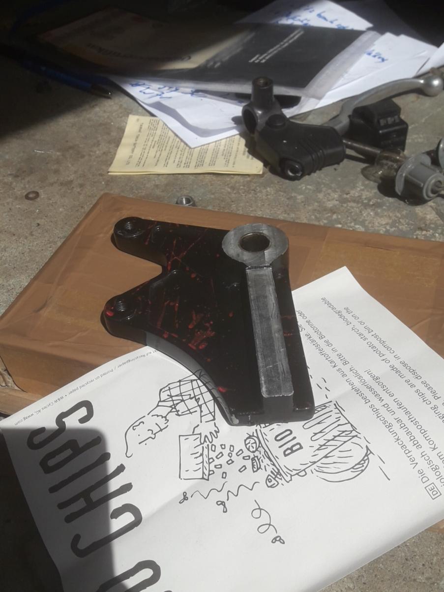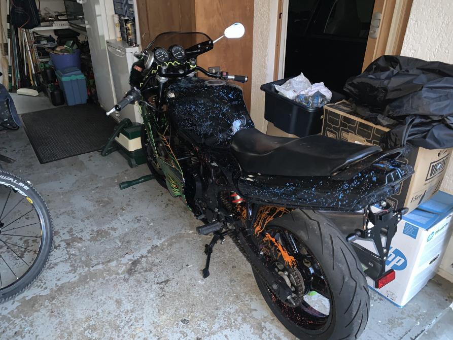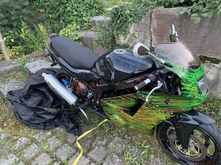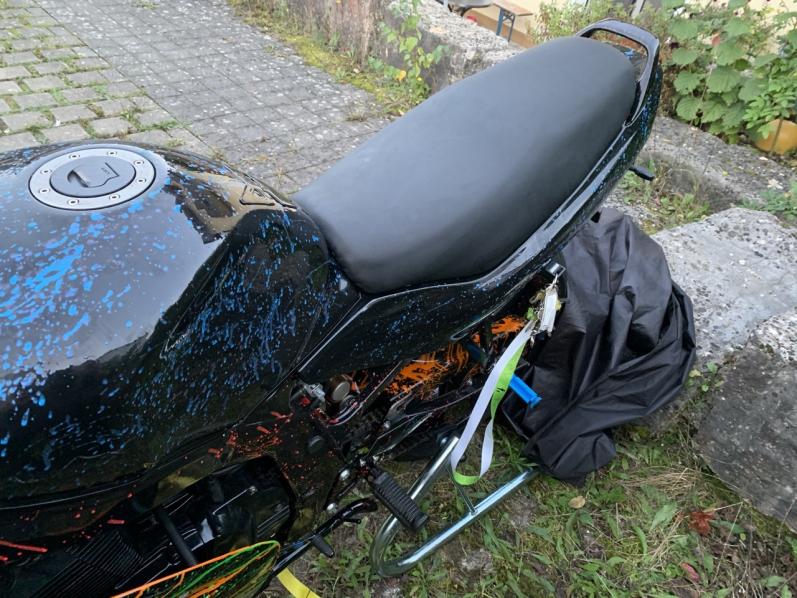 _____ Ich hatte nach einem Unfall 2015 schon zu lange kein fahrbares Motorrad mehr, dafür die Überbleibsel meiner alten GS und das lange Ewigkeitsprojekt, das mir regelmäßig durch seine bloße unfertige Existenz die Laune verdarb und meinem Vater im Weg rumstand. Letztes Jahr hat mich der Rappel gepackt und ich sammelte die besten angesammelten Teile zusammen, die mit annehmbarem Aufwand ein fahrbares Ganzes ergeben könnten. Zwei Urlaubswochen und viele Flüche später stand das, was ihr auf den Bildern seht, herum. Die Gabel sifft und der Lenker nervt, der Tüver stellte viele Aufgaben, zusätzlich ging mal wieder sowohl Zeit als auch Geld aus., eh klar ![]() Also habe ich am Freitag hier gepostet, um wieder Motivation zu bekommen, das Ding fertig zu bekommen. Es hat funktioniert, danke euch allen! ![]() ______ Hier ist die technische Seite: Hinterrad: SV650, je nach Tüver-Laune mit den Aluscheiben Bremsanker: RF600, abgefräst Schwinge: GS500 mit zwei angeschweißten Stahlklötzen für den Bremsanker Federbein: BMW S1000RR Vorderrad, und Gabelstabilisator: GSX600F AJ Gabel und Bremse: GSX600F GN72 Bremspumpe: Hoffentlich FZ6 RJ07 (16mm), zur Not GN72 (14mm) Gabelbrücke oben: VX800 Lenker: LSL Klemmböcke (noch mit geteiltem Superbikelenker) Fender: Irgend ein Prototyp, der nie in Serie ging Verkleidung: Gimbel RGV, zur einfacheren Wartung dreiteilig gemacht Heckunterverkleidung: Balu-Racing. Der Shop war letztes Jahr kaputt, aber Lutz hatte noch Sachen auf Lager. Das Sitzbankschloss habe ich an der Original-Halterung, wobei der Rest der Gepäckstrebe der Flex zum Opfer fiel. Für den Schlüssel ist ein Loch im Seitenteil. Radverkleidung: Balu-Racing, den Höcker für die Bremsankerstrebe habe ich weggemacht und die Verlängerung für die lange Schwinge wieder abgesägt. Tank: GS500F Sitzbank: GM51B, auf den Fotos ist der vordere Spitz noch nicht abgesägt. Wenn ihr Tipps zum Aufpolstern habt, immer her damit Rücklicht: In den Blinkern _____ Die Lacksachen haben am meisten Zeit gebraucht, ein bisschen weil die Verkleidung in einen Unfall verwickelt war, aber vor Allem weil ich beim ersten Mal Spritzspachtel-Auftragen nirgendwo lesen konnte, dass das Zeug Härter braucht. Es wurde auch keiner mitgeliefert. Ich naives, naives Ding. ![]() Vielen Dank an an dieser Stelle an meinen Bruder, der lieberweise richtig viel geschliffen und gespachtelt hat ![]() Die Devise bei der Farbgebung war, Lacknasen mit noch viel mehr Nasen zu verdecken, denn ich bin zu ungeduldig für sowas ![]() Die Basis ist Schwarz, darauf habe ich Neon-Pigmente in Klarlack gelöst von einem Pinsel geschleudert. Leider war ich mit Blau und Pink zu sparsam für meinen Geschmack. Darüber kam dann noch Klarlack, außer bei der Verkleidung. Bei der Verkleidung habe ich einfach direkt aus dem Farbbecher geschüttet, nachdem ich den Lack schon leicht anziehen ließ. Geändert von irgendwer92 (08.03.2020 um 21:23:09 Uhr) |