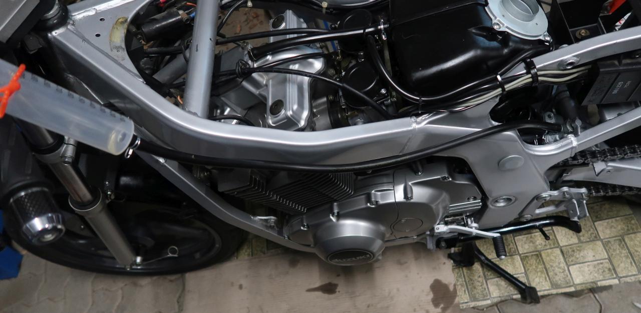 Heute habe ich es nicht mehr ausgehalten und den Motor mal kurz gestartet - noch ohne Tank und ohne Auspuff dafür aber mit neuem Luftfilter, neuen Zündkerzen und neuen Schläuchen am Vergaser/Benzinhahn.