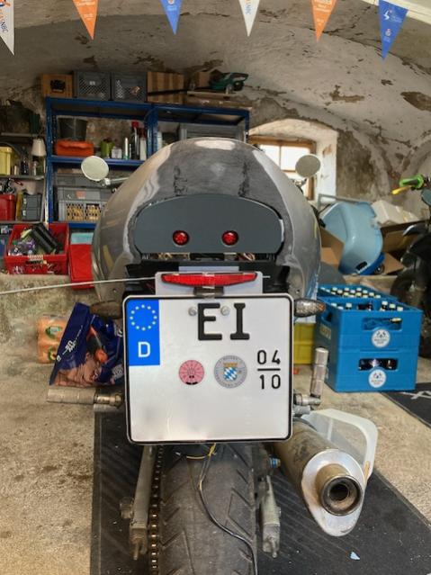 Hab heute am Rücklichtumbau weitergemacht und die Prototypen der Heckverkleidung und vom Kennzeichenhalter mal mit Beleuchtung montiert.