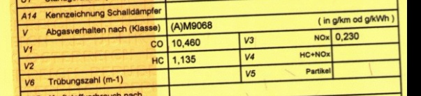 Hallo, ich habe Schwierigkeiten was sinnvolles bezüglich des erforderlichen Abgaswertes aus der Zulassungsbescheinigung Teil I zu entnehmen (ich frage mich, wer sich solche Inhalte, Bennenungen und Felder ausdenkt):