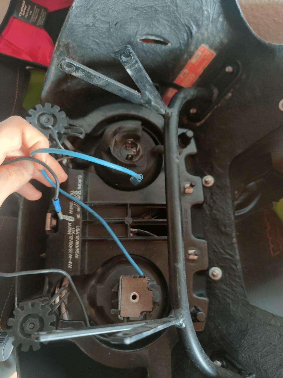 Gimpel Maske ab und an dem Relai (wo noch das blaue Kabel dran ist FOTO) alles bis auf Rot abgesteckt, H4 Kabel ab und dann abgenommen.