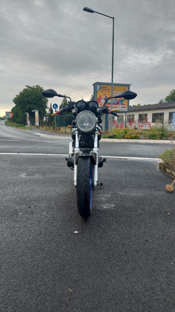 Ich habe die nasse Fahrbahn im Zusammenhang mit einem neuen Hinterschlappen unterschätzt. Die Maschine rutschte mir im Kreisverkehr weg und rutschte ca. 10 Meter. Neben Verkratzungen am Motor, verbogenem Kupplungshebel und gebrochendem Blinker ist das Vorderrad nun schief in der Gabel.