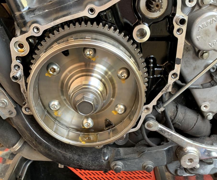 Ich hatte ja den Seitendeckel links abgemacht und direkt an der Befestigungsschraube (siehe Foto) des Anlasserfreilaufs gedreht und wenn ich einen Gang einlege dreht sich auch das Hinterrad. Von daher bin ich mir absolut sicher das sich die KW dreht. Auch über den Anlasser und den Mitnehmer.