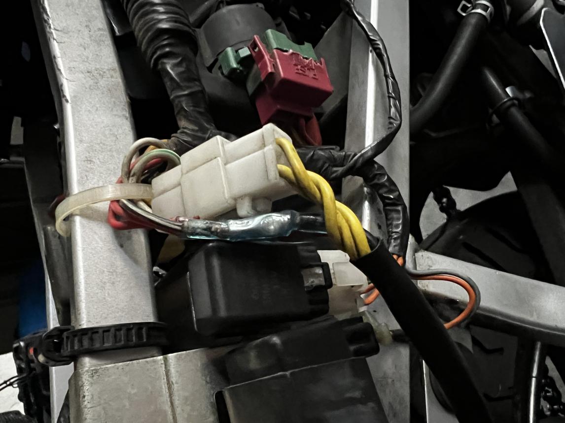Die Sicherung sitzt am Starterrelais. Original hat das Starterrelais einen Gummimantel mit dem es auch am Rahmen eingehakt ist. Darin sollte sich eine Sicherung befinden. Das ist aber nur die Ersatzsicherung. Die eigentliche Sicherung sitzt in einem kleinen Plastikkästchen das am Starterrelais angeschraubt ist.