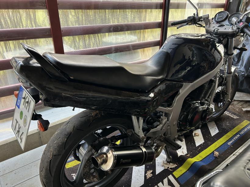 Den Auspuff erstmal wieder angebaut, damit sie fahrbar ist.