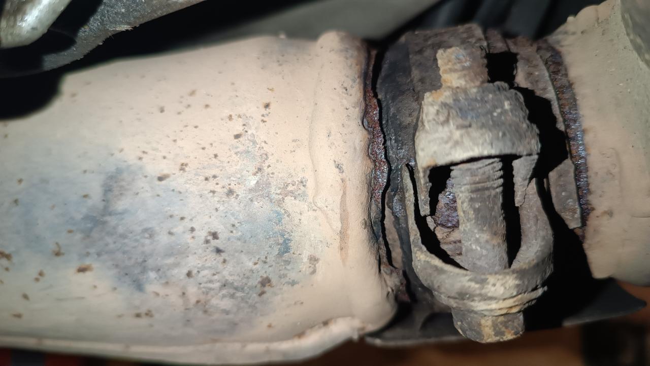 Es wird ein neues Stück Rohr angeschweißt, geschlitzt und alles wieder verbunden. In dem Zuge kommen dann gleich die Halbmonde am Krümmer neu und die Schrauben werden durch Stehbolzen und Hutmuttern ersetzt. Materialkosten roundabout 100€
