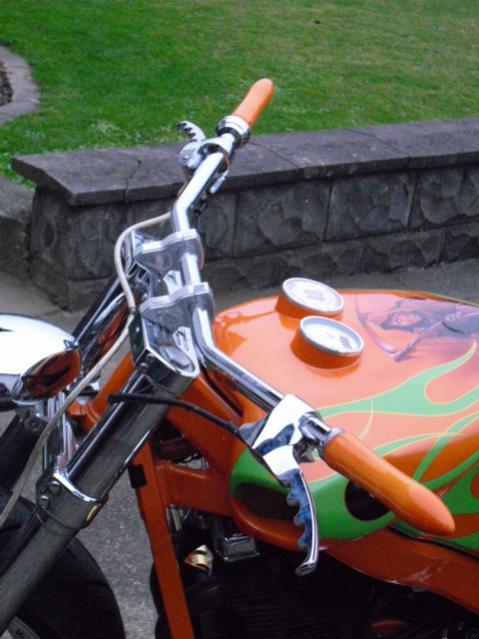 zu 1: stimmt ging, aber doch zu Choppermässig! zu 2: wird erst montiert und dann lackiert, so wie der ganze Rest von Rudi auch. Kommt wieder Orange mit der klassischen Rudibemalung und Schriftzug. So heute den Lenker mit der Flex bearbeitet und montiert. Sind jetzt nur noch 92 cm Lenkerbreite und ih hoffe, dass das reicht zum fahren. Morgen noch das Heck ein wenig anheben und dann ne kurze Probefahrt machen. Bild gibts dann morgen.