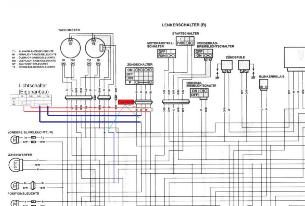 Ich habe hierfür ein 5-poliges Relais genommen (bistabil). Die Verkabelung dachte ich mir folgendermaßen: Masse und Standlicht sind auf Pol 30 vom Relais, das Kabel vom Abblend-/Fernlicht sind auf 87a (die 3 Kabel waren vormals im rechten Lenkerschalter, nur habe ich in meinen neuen Armaturen keinen Schalter drin). Das heißt, dass das Licht permanent angeschaltet ist, wenn das Relais in Ruhestellung ist. Zieht das Relais dann an, schaltet es auf Pol 87 um, wo aber nichts dranhängt; heißt Licht geht aus (bis auf das Standlicht, das ist zu jeder Zeit bei aktiver Zündung an, weil es mit Masse zusammen auf Pol 30 hängt). Um das Relais jetzt zu schalten dachte ich mir, dass das Licht ja nur zu genau einem Zeitpunkt aus sein sollte, nämlich wenn man startet. Praktischerweise ist die eine Leitung vom Starterschalter frei zugänglich und hängt in keiner Buchse im Lampentopf drin (gelb-grünes Kabel). Ergo habe ich statt der vorhandenen Japanstecker normale Flachstecker draufgequetscht und an die Steuerleitungen des Relais gehangen (Pol 85 und 86). Beim Test kam dann allerdings die Ernüchterung: Bei aktiver Zündung geht das Licht wunderbar an, Umschalten auf Fernlicht klappt logischerweise auch und wenn ich den Starterknopf drücke geht das Licht (bis auf das Standlicht) aus. Funktioniert also wie es soll. Nur springt die Maschine dann nicht an; nichtmal ein Klackern vom Starterrelais ist zu hören. Ziehe ich die Kabel des Starterknopfs vom Relais ab und verbinde sie miteinander springt die Maschine einwandfrei an; nur das Licht wird eben nicht mehr ausgeschaltet... Jetzt ist die Frage: woran scheitert es, dass am Starterrelais anscheinend kein Saft mehr ankommt?