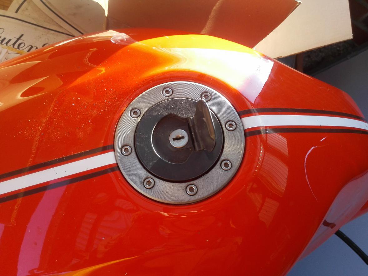 Das Tankdeckelschloss vom F-Tank ausgebohrt (mit nem 7er cobaltlegierten VA Bohrer und ner kleinen 320W Bosch Bohrmaschine), den neuen Deckel aus dem Schlosssatz von Ric angebaut, das Sitzbankschloss getauscht und die Verkabelung im Scheinwerfer gerichtet.