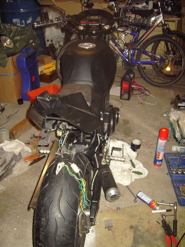 Elektrik war heut dran...naja hab rücklicht kennzeichebeleuchtung und scheinwerfer in gang bekommen gott sie dank aufs erste mal...anders sahs da mim tacho aus...funzt hint und vorne nicht..verdammt war also doch nich in ordnung....najo geld rausgeworfen udn gleich den neuen von koso bestellt den MX DB-01R von louis gefällt mir und hoffentlich geht der auch dementsprechend...mann mann muss doch endlich fertig werden zefix...naja donnerstag is wieder bisschen zeit da werd ich ma endlich die blechabdeckung machen und elektrik richtig verlegen, denn lass ich se mal an brauch wenigstens des