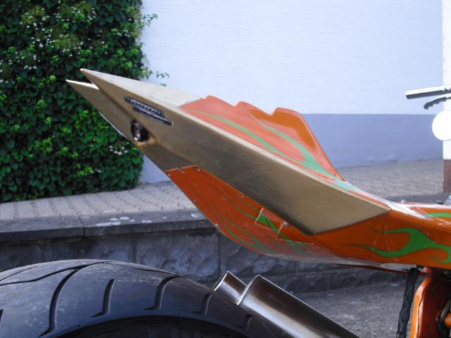 so heute den Höcker zurückbekommen. Kamera, Blinker und rücklicht sind drin. Da sich der Neue Lack nicht mit dem Alten Lack vertragen hat, wurde das Endstück in Blattgold gemacht! War eigentlich die Beste Lösung, da ich keine neue Lackierung wollte. Die kommt erst Ende des Jahres drauf, wenn alles klar geht. Fehlt jatzt nur noch der Tank und das andere Federbein! Sollte aber klappen bis Freitag. Hier noch ein paar Bildchen: