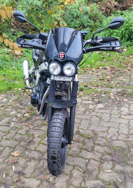 Da ich doch noch ein bisschen aus dem Fahrtwind raus wollte, wurde der noch in der Garage vorhandene Windabweiser von einem Scheinwerfer auf Doppelscheinwerfer umgebaut. Leider findet man für Doppelscheinwerfer kaum etwas brauchbares im Netz. Da der Schild zu wackelig war, wurden auch gleich noch Streben zu den Handprotektoren eingebaut. Ausserdem die Halterung des Endtopfs ein wenig modifiziert, damit er ein wenig höher kommt und die Drehzahlmesser Welle massiv mit Fett versorgt und mit weniger Knicken verlegt, da der Zeiger angefangen hat zu schaukeln.
