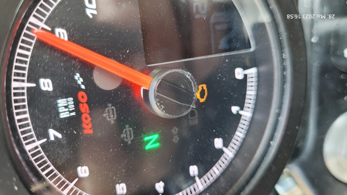 Der "Schuss" äussert sich dadurch, dass er bei ca. 7.000 Umdrehungen schlagartig auf ca. 14.000 springt und dabei die Null-Basis verliert. Nach den ersten beiden Malen konnte ich durch 2-3malö Zündung aus und wieder an den DZM wieder auf Null bringen. Jetzt hat er die Null irgendwo bei 9.000 ... die Gänge zeigt er korrekt an, die berechnet er ja aus Drehzahl und Geschwindigkeit.