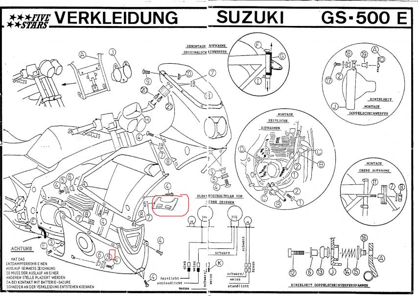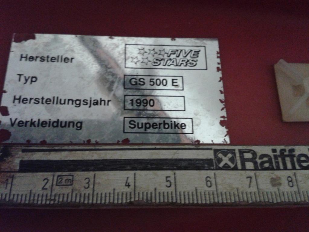 Bei der Verkleidung handelt es sich wohl um die "Eliptic" http://www.gs-500.info/index.php?tit...eb%C3%A4r2.jpg. Mit dem Aufkleber: hersteller - five stars, typ - gs 500 e eliptic, verkleidung – superbike.