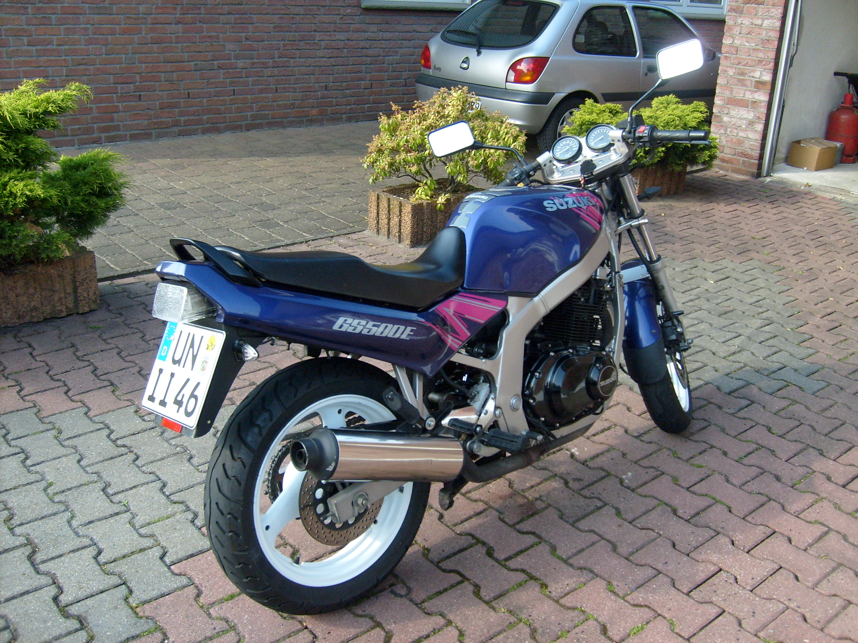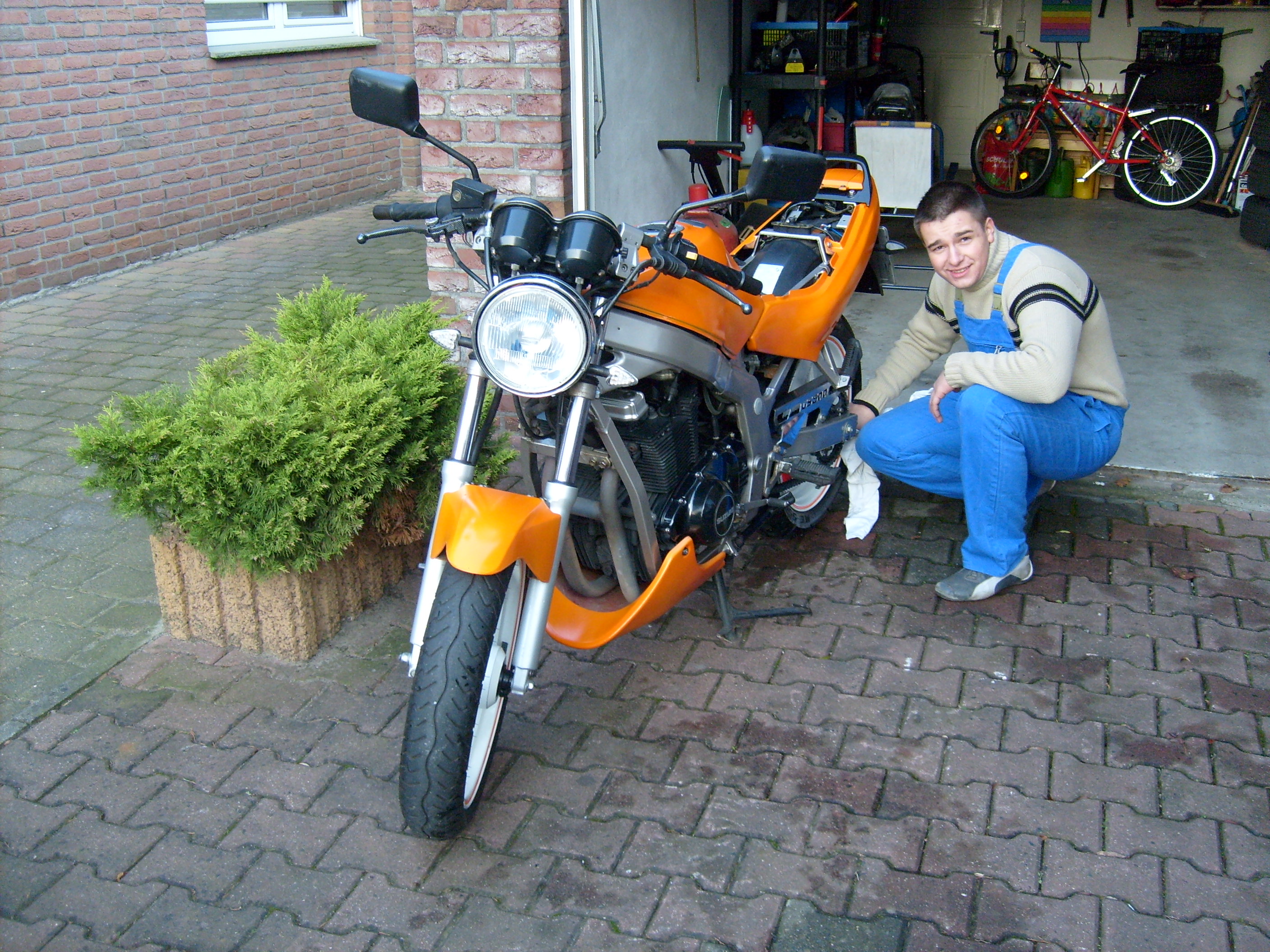 ich möchte Euch mal meine GS vorstellen. Ich habe Sie Anfang 2008 gekauft und seitdem nach und nach ein wenig meinem Geschmack angepasst. Sie ist Bj. 93, offene 46 PS, hat einen Km-Stand von ca. 32.000 und ist top gepflegt Veränderungen: -LED-Tachobeleuchtung in blau (demnächst orange) -LED-Blinker vorn und hinten von Shin-Yo inkl. lastunabhängiges Relais -Bugspoiler von MBD -Brems- und Kupplungshebel in Carbonoptik -Abblendlichtbirne MTEC Superwhite -MD-Öltemperaturanzeige -Felgenrandaufkleber in orange -Neulack in Electric-Orange-Met. vom Ford Focus ST -Takkoni Auspuff Als ich sie gekauft habe, sah sie noch so aus: [attachment=8:gxtxq4bi]S6300936.JPG[/attachment:gxtxq4bi] [attachment=7:gxtxq4bi]S6300946.JPG[/attachment:gxtxq4bi] Mir war sofort klar, dass meine GS 500 nicht so bleiben konnte. Also beschloss ich direkt ein paar Verschönerungen durchzuführen Als erstes sofort den Spritzschutz hinten und die Scheibe vorn abmontiert und ein paar Aufkleber entfernt! Daraufhin sah sie so aus: [attachment=6:gxtxq4bi]Bild205.jpg[/attachment:gxtxq4bi] [attachment=5:gxtxq4bi]Bild220.jpg[/attachment:gxtxq4bi] Schon ein wenig besser Mich störten noch die Blinker und das Rücklicht, also alles in LED-Technik! [attachment=4:gxtxq4bi]S6301325.JPG[/attachment:gxtxq4bi] Sooo... und da mir dieses LILA auf den Sack ging, habe ich die ganze Karre in Electric-Orange-Metallic lackiert! Zwar selbst mit der Hilfe eines Kollegen mit der Sprühdose aber dieses Jahr wirds nochmal fachmännisch vom Lackierer gemacht! Bugspoiler ist auch noch dazugekommen. [attachment=3:gxtxq4bi]S6302953.JPG[/attachment:gxtxq4bi] Felgenrandstreifen in orange sind auch hinzugekommen (war das ne Arbeit [attachment=2:gxtxq4bi]S6302950.JPG[/attachment:gxtxq4bi] Aber ich finde es hat sich gelohnt [attachment=1:gxtxq4bi]S6302952.JPG[/attachment:gxtxq4bi] Nun macht Sie einen Winterschlaf und wurde schön von mir geputzt und konserviert: [attachment=0:gxtxq4bi]S6303432.JPG[/attachment:gxtxq4bi] Dieses Jahr folgt: -Fachmännische Lackierung (ist grad in Arbeit) Das wars eigentlich vorerst von mir... Würde mich über ein paar Meinungen freuen! |