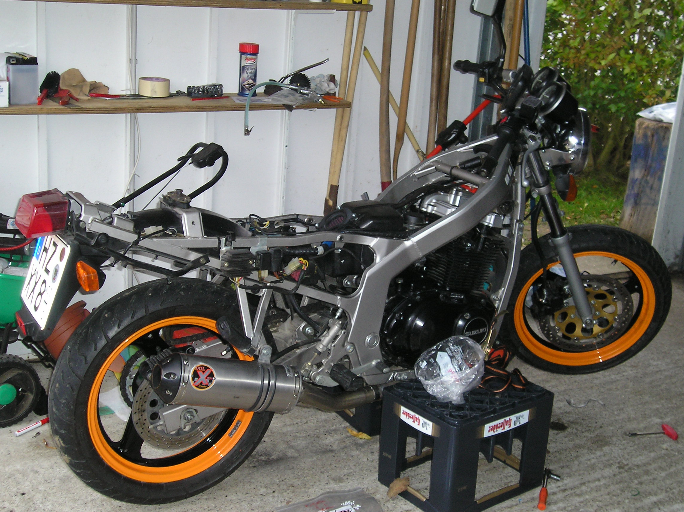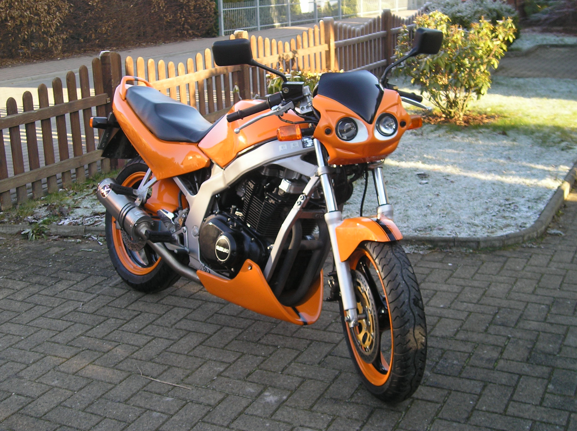 Meine GS hab ich vor gut 5 Monaten gekauft in diesem doch recht gutem Zustand. [attachment=6:2gk6zi2i]P1010064.JPG[/attachment:2gk6zi2i] tja aba irgendwie reichte es mir nicht^^ und es kamm ein IXIL dazu und ein K&N Luftfilter hinzu. Tja und dann war auch schon wieder winter Da ging der Umbau so richtig los so sah sie zwischenzeitlich aus [attachment=5:2gk6zi2i]P1010085.JPG[/attachment:2gk6zi2i] In dieser Zeit habe mir so einige Dinge gekauft. Bugspoiler Hinterradabdeckung eine Lichtmaske die Lackierung wurde vom Profi gemacht un heißt Kommunal Orange mit schwarzen Raching Streifen finde das es super aussieht. Ich habe versucht diesen "Styl" über das Motorrad zu verbreiten sprich felg und alle anderen Teile. so sieht sie nun aus [attachment=3:2gk6zi2i]P1010107.JPG[/attachment:2gk6zi2i] [attachment=4:2gk6zi2i]P1010109.JPG[/attachment:2gk6zi2i] [attachment=2:2gk6zi2i]P1010124.JPG[/attachment:2gk6zi2i] [attachment=1:2gk6zi2i]P1010127.JPG[/attachment:2gk6zi2i] [attachment=0:2gk6zi2i]P1010130.JPG[/attachment:2gk6zi2i] So sieht sie bis jetzt aus Moment kommen noch Miniblinker und LSL Fussraste dran. Dann ist sie fertig und warte auf besseres Wetter als schnee und Kälte