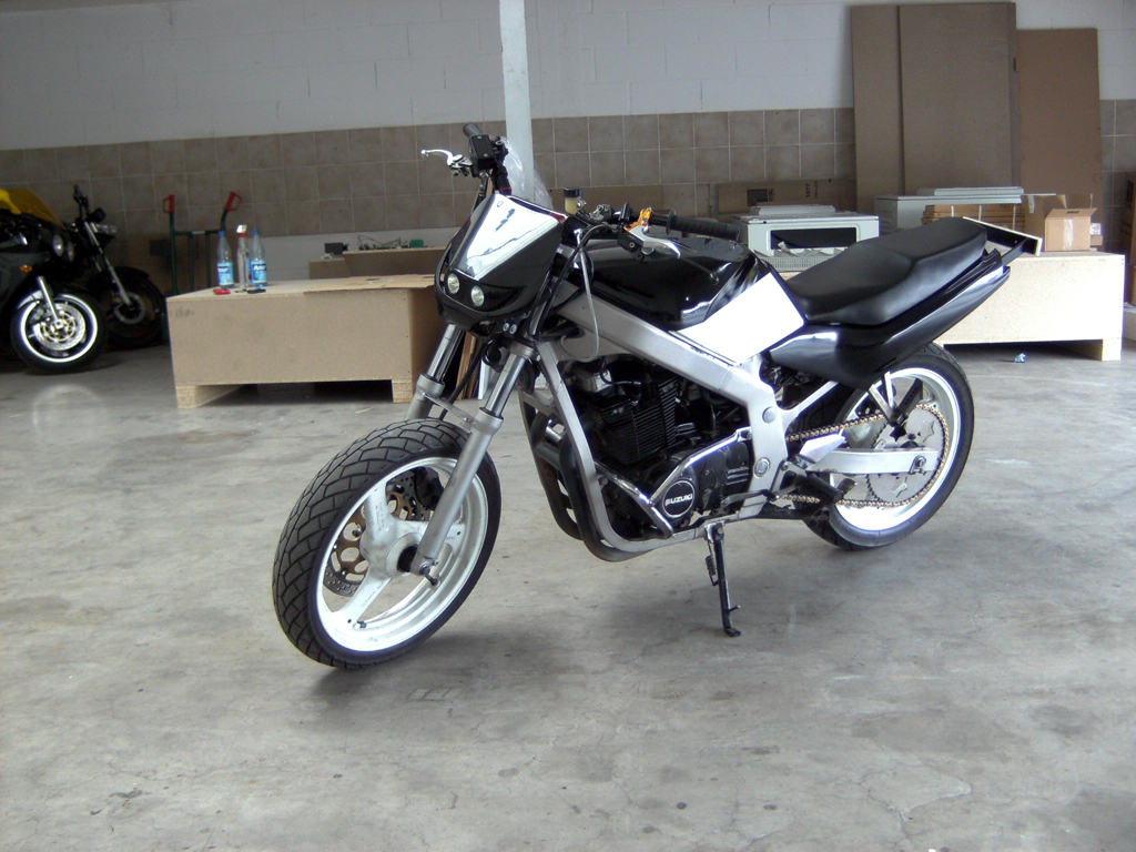 Suzuki GS 500, Baujahr: 1993, Laufleistung: 57.500 km Umbauten / Änderungen: - SB-Lenker ABM - MBD Bugspoiler - Doppelscheinwerfer - Miniblinker - Doppelrücklicht - Gimbel Variohöcker - Eigenbau Lampenmaske - Edelstahl ESD Takkoni - Eigenbau Kettenschutz aus Edelstahl