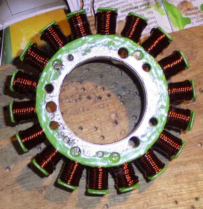 Die Fasen wurden nacheinander gewickelt. So musste ich zuletzt nur die drei Enden miteinander verbinden (genau so, wie das vom Werk aus war) Hab bei den gelben Seiten die Betriebe gesucht. Es gibt hier noch einen kleinen Betrieb, aber dort hab ich weder telefonisch noch persönlich niemanden erreicht. Und in Velbert gibt’s eine große Wicklerei. Die machen aber nur die größeren Maschinen neu wickeln. Als ich da mit meinem kleinen Stator aufgetaucht bin, haben die nur gelächelt. Von dort hab ich auch den Kupferlackdraht geholt. |
